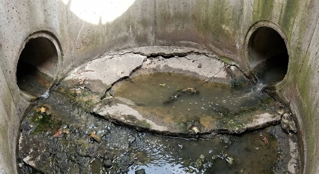- 🛑 Le regard de passage (Anormal) : Si c’est un simple regard de visite avec une cunette (goulotte) au fond, il doit être sec ou l’eau doit s’écouler vite. Si l’eau stagne, il y a un défaut de pente ou un bouchon en aval.