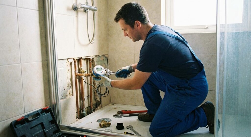 Pas toujours. Les débitmètres s’insèrent facilement sur les douches à flexible souple. Si vous avez une colonne rigide (tuyau en métal qui monte au plafond), il faut vérifier s’il y a un raccord standard 1/2″ accessible entre le mitigeur et la colonne, ce qui n’est pas systématique. Sur les douches encastrées, l’installation est impossible sans travaux.